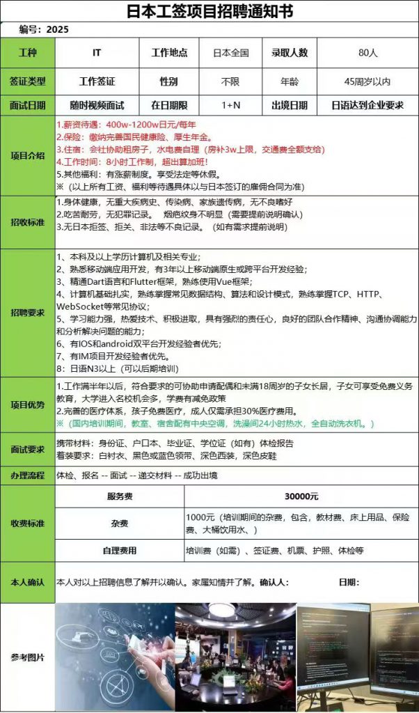 [庆祝][庆祝][庆祝]日本全国招收大量IT人才,年收400w-1200w日元(根据能力不同)会社协助租房子有房补,交通费全额支给,要求:本科及以上学历计算机等相关专业,3年以上相关工作经验,日语N3以上(后期可培训)欢迎随时咨询[红包][红包][红包]