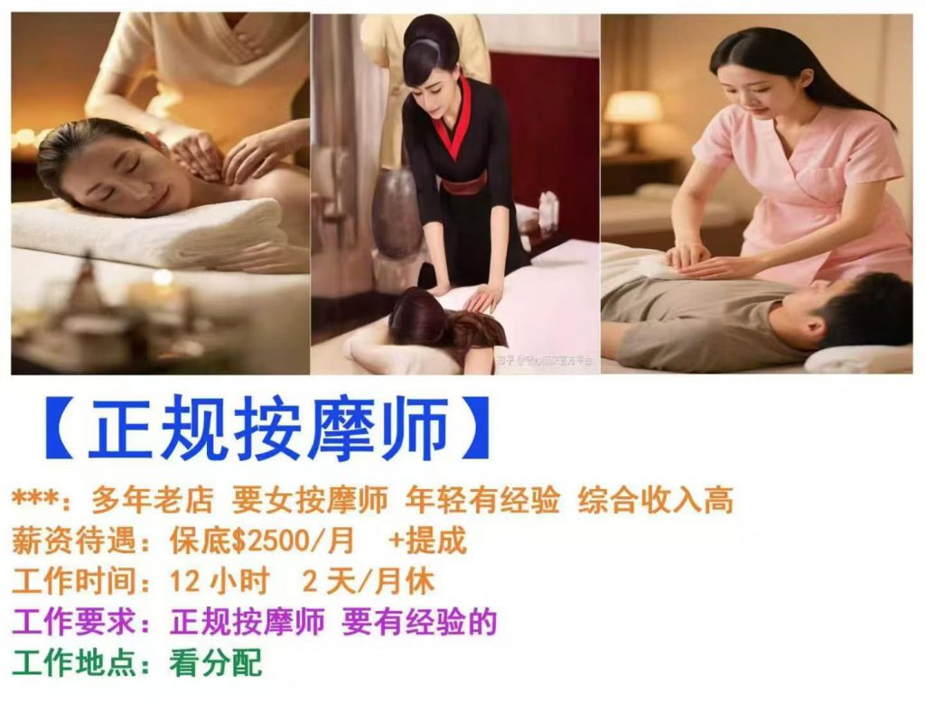 By -xiao, panPosted on 2025年10月24日Posted in 新加坡就业 【正规按摩师】***:多年老店 要女按摩师 年轻有经验 综合收入高薪资待遇:保底$2500/月 +提成工作时间:12小时 2天/月休工作要求:正规按摩师 要有经验的工作地点:看分配 ☎15550399119(微信同号) Post Views: 12