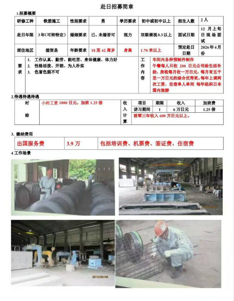 [烟花]合作十几年的老订单,滋贺钢筋施工男工2名会社提供工作餐(每顿饭只扣200日元、折合人民币不到10元),会社有自己的专门住宿公寓,住宿单人单间,每月会有5000-10000日元的奖金,每年会上调两次工资、公司经常组织团建、日本国内游等、福利待遇多多
