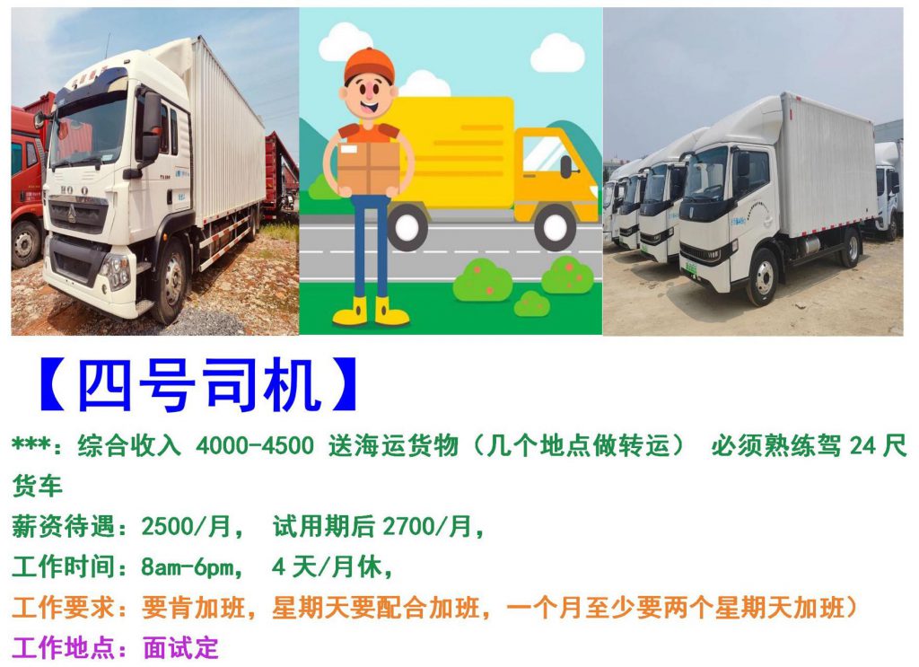 ***:综合收入 4000-4500 送海运货物(几个地点做转运) 必须熟练驾24尺货车