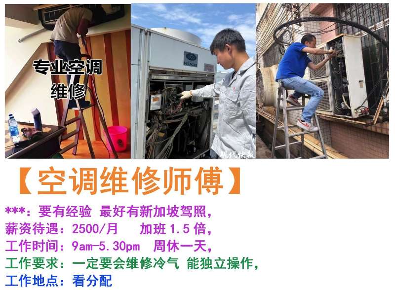 By -xiao, panPosted on 2025年11月3日Posted in 新加坡就业 【空调维修师傅】***:要有经验 最好有新加坡驾照,薪资待遇:2500/月 加班1.5倍,工作时间:9am-5.30pm 周休一天,工作要求:一定要会维修冷气 能独立操作,工作地点:看分配 ☎15550399119(微信同号) Post Views: 7