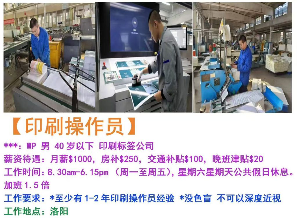**:WP 男 40岁以下 印刷标签公司 薪资待遇:月薪$1000,房补$250,交通补贴$100,晚班津贴$20 工作时间:8.30am-6.15pm (周一至周五),星期六星期天公共假日休息。加班1.5倍 工作要求:至少有1-2年印刷操作员经验 *没色盲 不可以深度近视