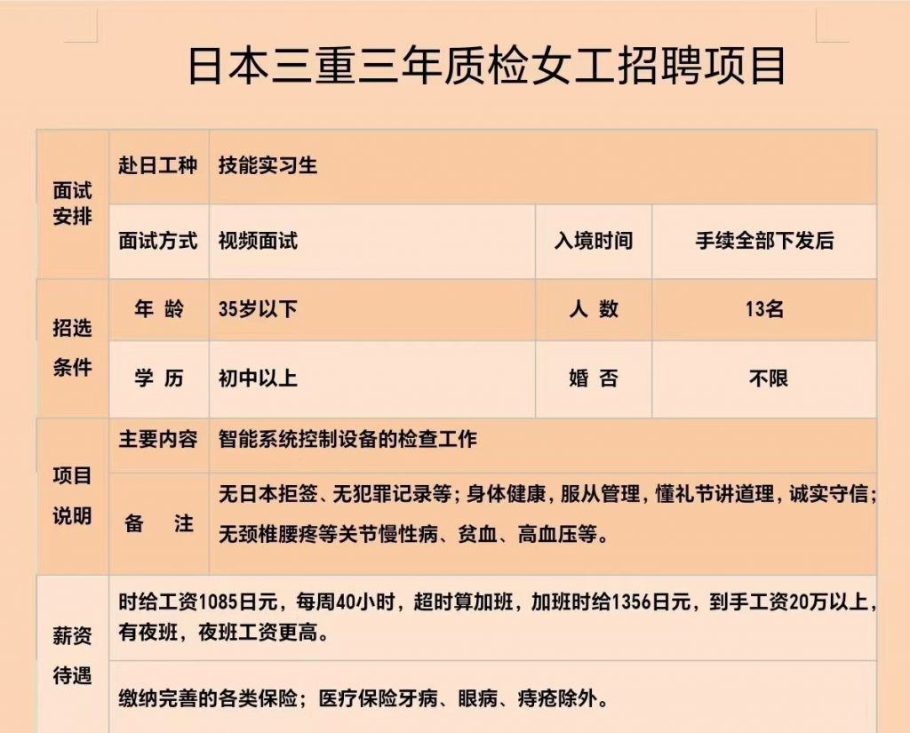 日本三重招聘质检员:女生,13人,35岁以下,婚姻不限,地域不限,白班到手工资24万日元,夜班到手工资30万日元。视频面试,网络培训。