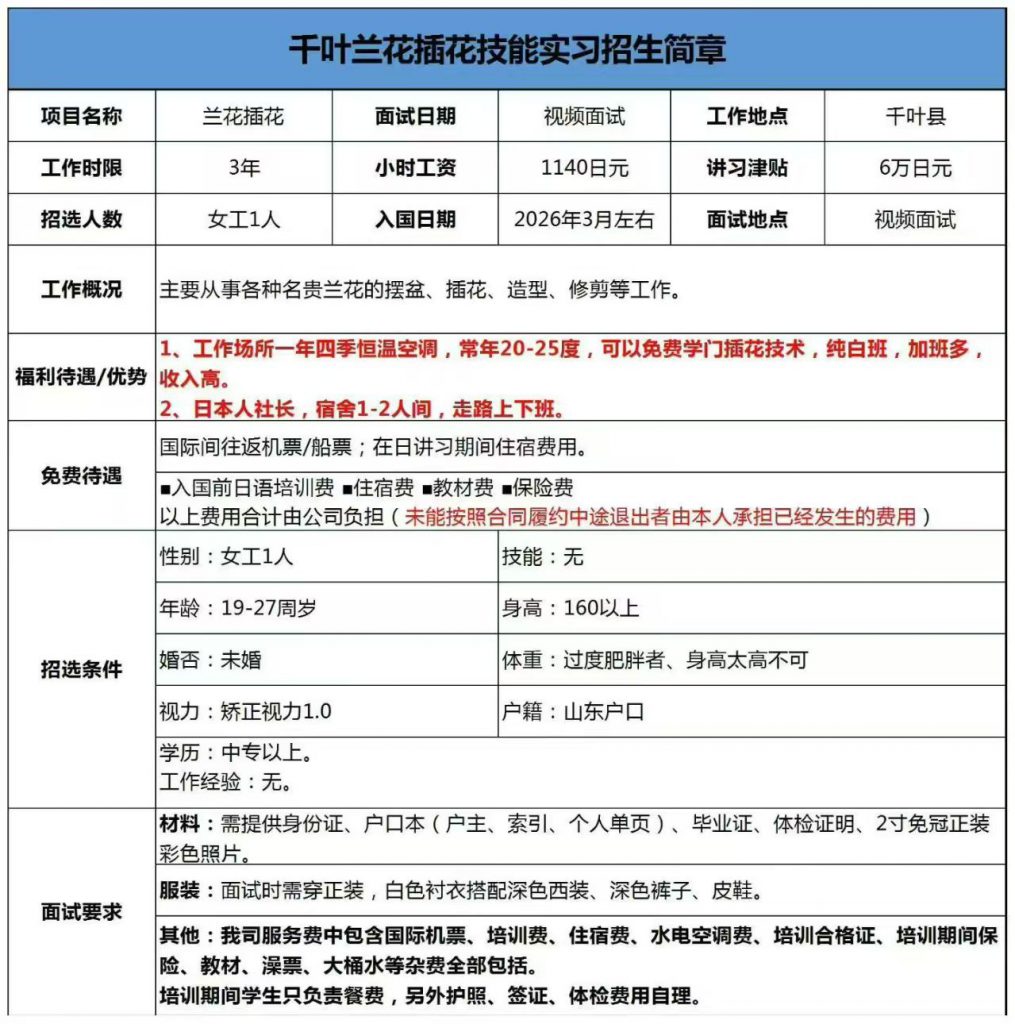 [耶][耶]赚钱的同时还能学个手艺——千叶县兰花插花技能实习项目追加1人,选拔19-27周岁女工。时薪1140日元:要求山东户口,身高160以上。视频面试!