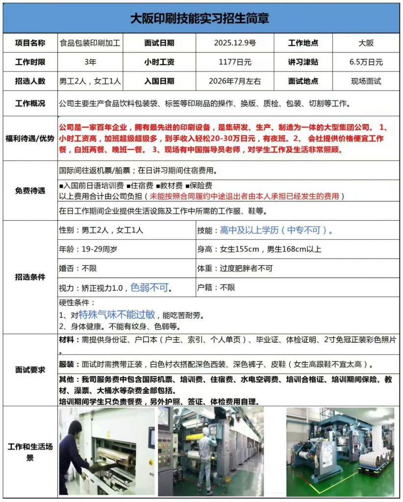 [庆祝][庆祝][庆祝]3年带回35-45万的最挣钱实习生订单!实习生满意度100%!!!金牌大阪印刷女工1人,男工2人,19-29周岁,色弱不可!!!要求高中及大专以上学历(中专初中不可,对日语要求高)!!!主要生产食品饮料包装袋、标签等印刷品的操作、换版、质检、包装、切割等工作,超级轻松,不是书本类印刷累。公司是一家百年企业,拥有最先进的印刷设备,是集研发、生产、制造为一体的大型集团公司。 项目优势:1、💰小时工资高,大阪时薪1177日元,加班超级超级多,月收入轻松20–30万,有夜班。 2、🍚会社提供低价工作餐,白班两餐、晚班一餐,价格便宜。3、现场有中国指导员老师,对学生工作及生活非常照顾。12月9号威海现场面试。