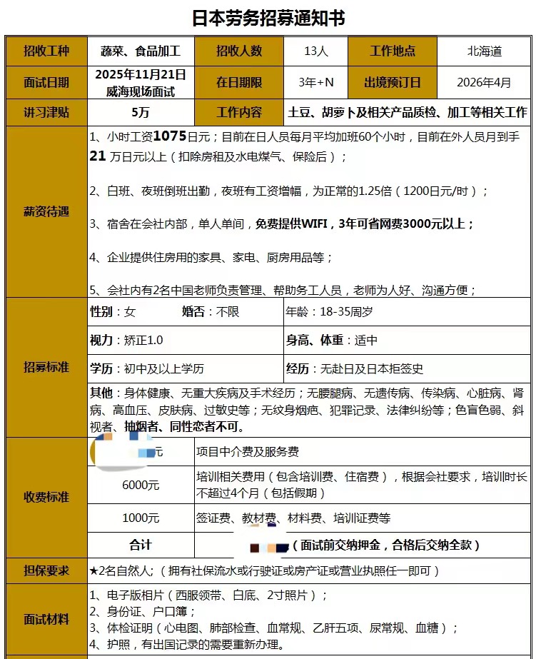 2025.11.15 日本蔬菜、食品加工 小时工资1075日元