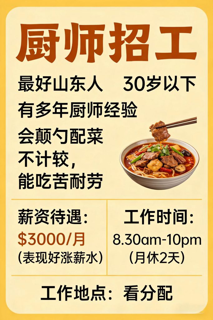 By -行则至Posted on 2026年3月17日Posted in 新加坡就业 【 厨师 】***:最好山东人 有多年厨师经验薪资待遇:$3000/月 表现好涨薪水工作时间:8.30am -10pm 月休2天工作要求:30岁以下 会颠勺配菜 不计较,能吃苦耐劳工作地点:看分配📞15550399119(微信同号) Post Views: 3