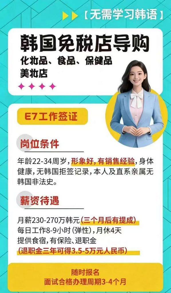 By -行则至Posted on 2026年3月26日Posted in 韩国就业 韩国工签首尔中文免税店, 不用学韩语,男女均可,月薪¥1-1.5万元,做化妆品/保健品销售(中国团), 🈶多人成功案例,包住包工餐,🈶带薪假13薪! 📞15550399119 18363467569(微信同号) Post Views: 3