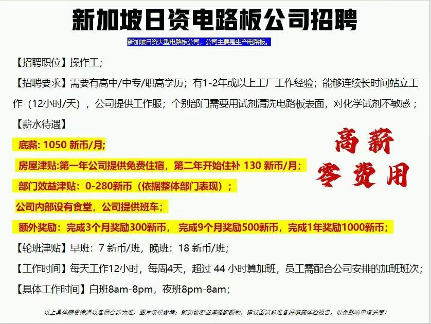 By -行则至Posted on 2026年3月30日Posted in 新加坡就业 0费用项目🔥烟台现场面试⚠️⚠️待遇很好,只要山东户籍,不要大专以上学历!不要有纹身! 男生, 有工厂经验即可; 承担赴新机票,报销中国体检费用; 有住 有食堂♥有奖励 📞15550399119 ➕ 📞18363467569(微信同号) Post Views: 4
